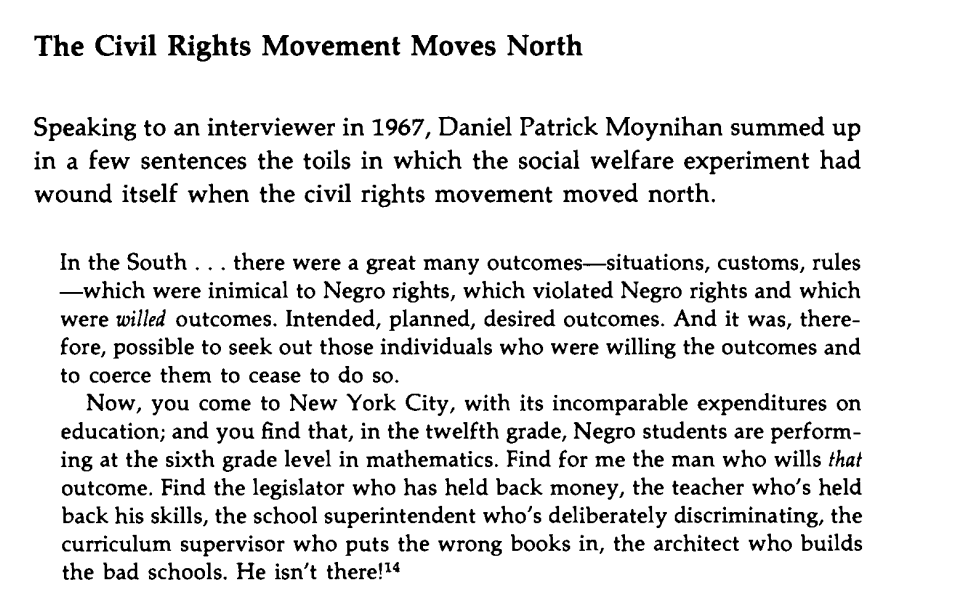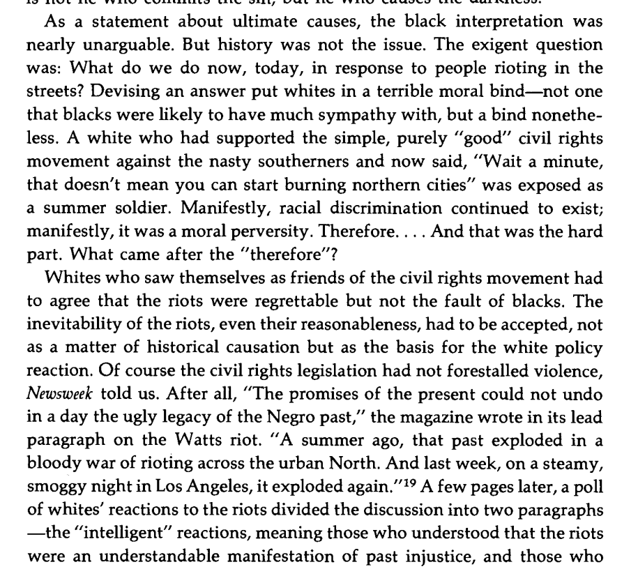On the Civil Rights movement as it moved north. In the South, there were specific, intentional legal disabilities for blacks. These didn't exist in the north, and were fully abolished nationally with the 1964 CRA. 13 days after the bill was signed, the race riots started. Image