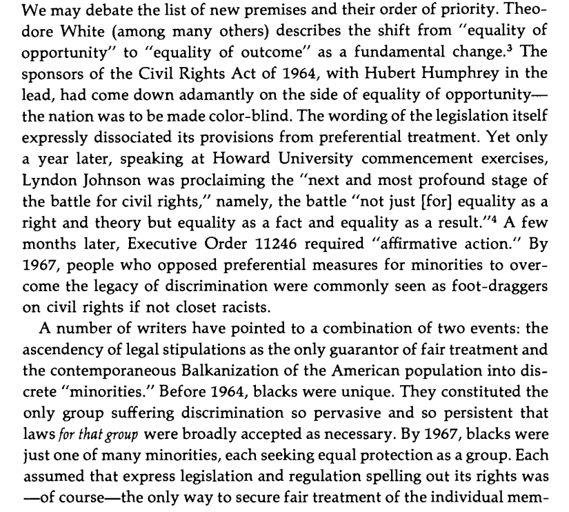 Before 1964, blacks were unique, the only group thought to need specific laws protecting them. After 1964, America was balkanized into many different minorities, each deserving corporate protection as a group. This is a de-modernization and de-liberalization process. Image