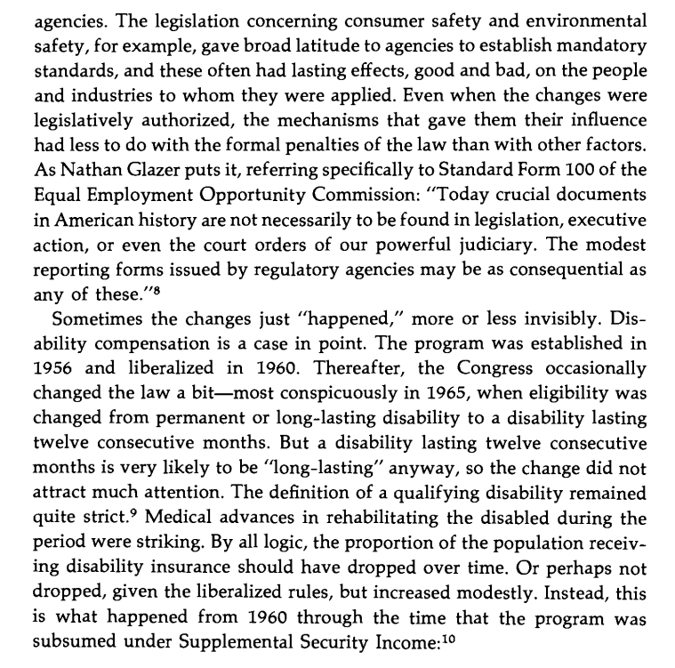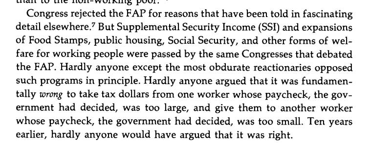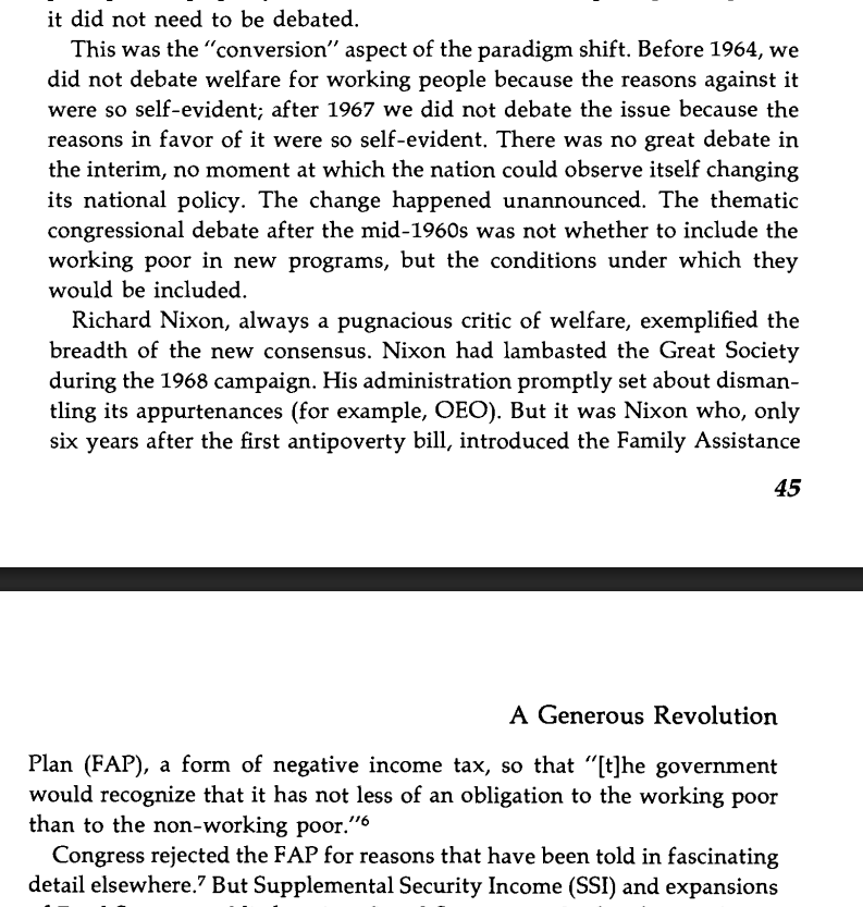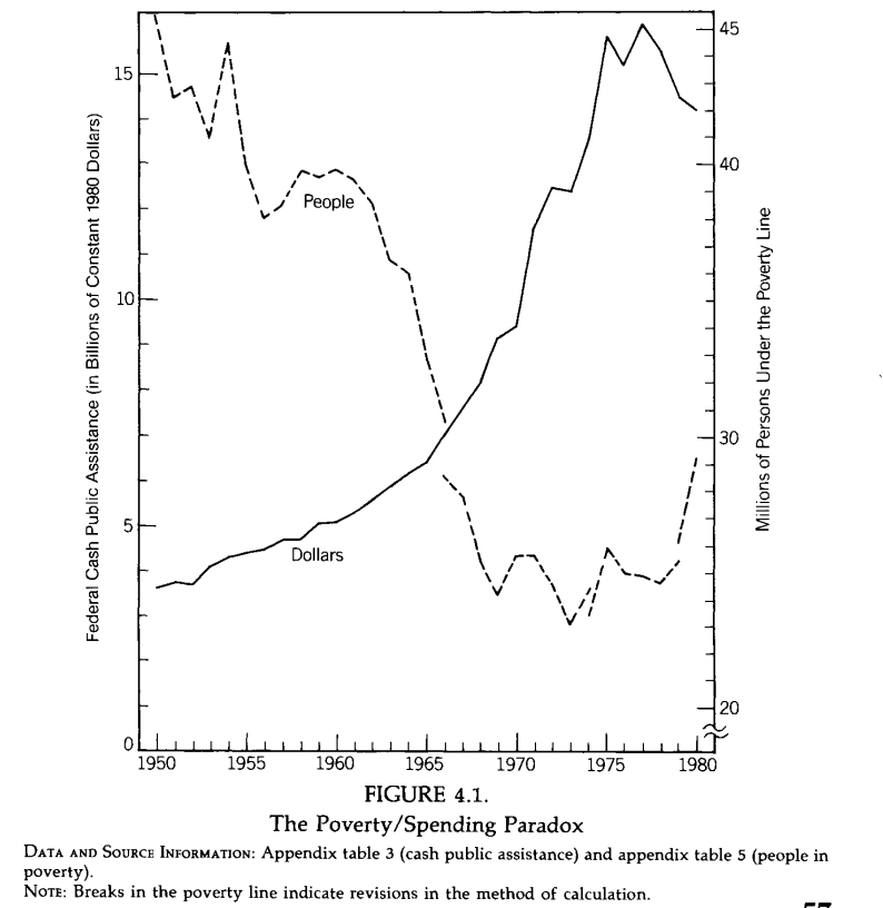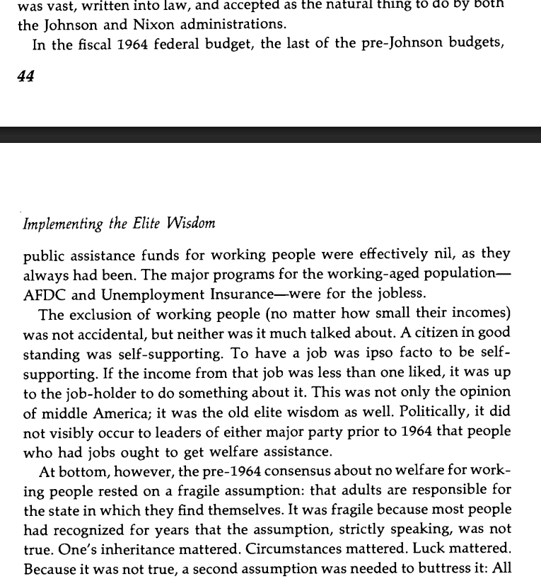 Before 1964, there were effectively zero welfare programs for the employed, the assumption being that if you had a job that paid less than you would like, that was your problem. That assumption changed under Johnson and Nixon; a low-paying job became the system's fault. Image