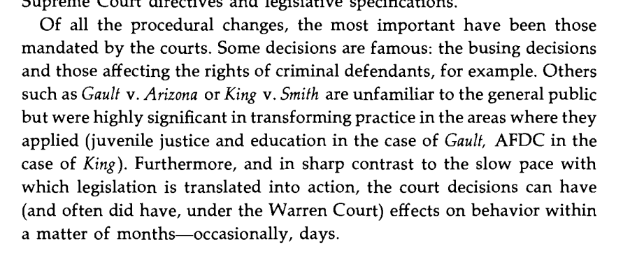 The most important procedural changes were mandated by courts. Ex: King v Smith (states must provide AFDC to mothers cohabiting with men not the fathers of their children), and Gault vs Arizona (juvenile correction must follow the same procedures as criminal punishment). Image