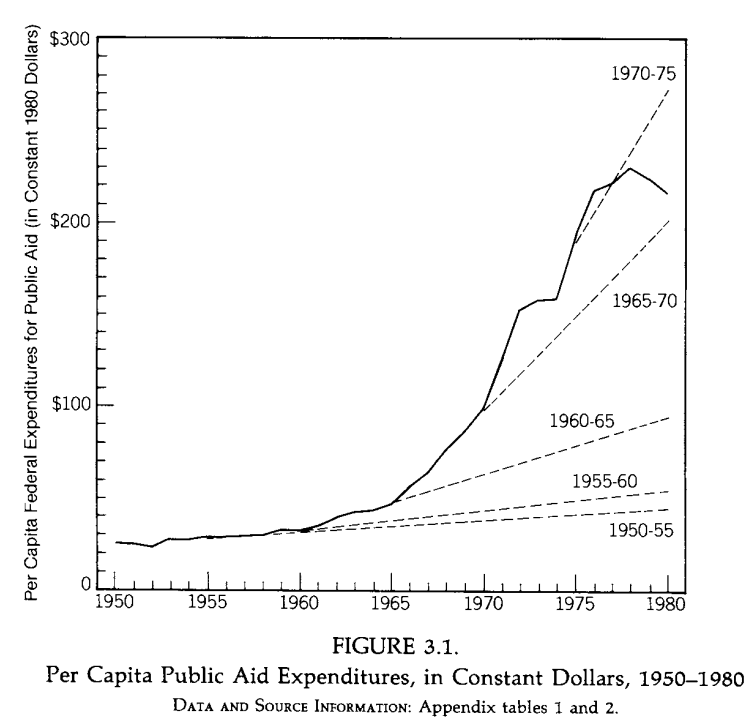 Social welfare expenditures increased by a factor of 20 (!) 1950-1980. The goals, per Kennedy, who initiated this change: preserving the family unit and ending dependency, disability, ill health, and juvenile delinquency. Image
