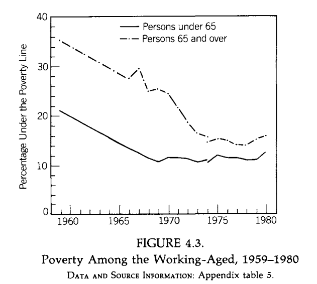 Official poverty, based on cash incomes (including welfare checks), stagnated and rose as Great Society welfare programs kicked in. And this happened sooner and more completely for the working-age than the elderly. Image