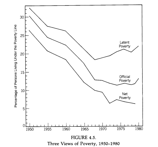 The three views of poverty - ending 'latent poverty', meaning inability to support one's self at a decent standard of living without government assistance, was the initial goal. 'Official poverty' counts cash transfers as income. 'Net poverty' counts in-kind transfers. Image