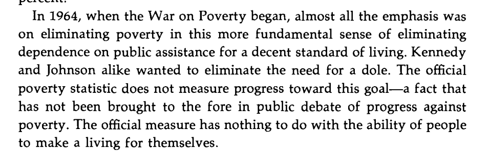 When the War on Poverty/Great Society began, poverty the goal was to end the dole. This objective was changed/redefined to expanding the dole enough to give a decent standard of living no matter what - and failed at that too. Image