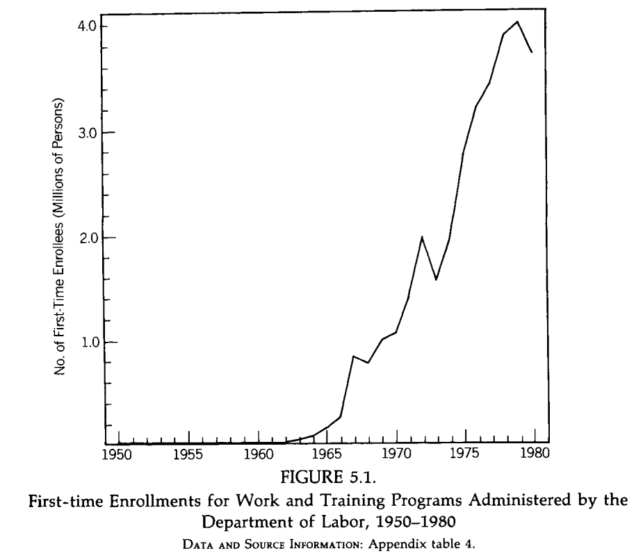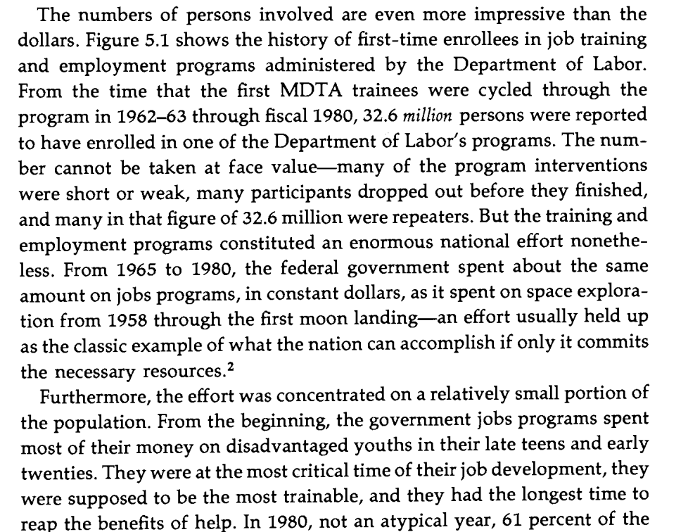 The Federal government spent about as much money on jobs programs 1965-80 as it did on the space program 1958-through the Moon Landing. For every 5 16-24 blacks in the labor force, there were 2 in CETA jobs programs (vs 14:1 ratio among whites). Image