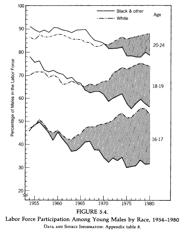 Young black male labor force participation also fell off a cliff both absolutely and relative to whites; this was unprecedented and not predicted. Image