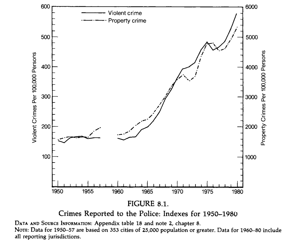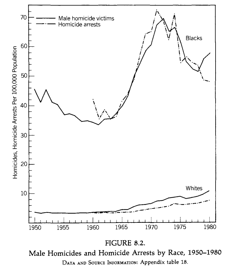 The explosion of reported violence and property crime 1950-1980. Black homicide rates dropped 22% in the 1950s, only to explode after 1965 with the initiation of social programs initially intended to solve violence by attacking "root causes" [lol]. Image