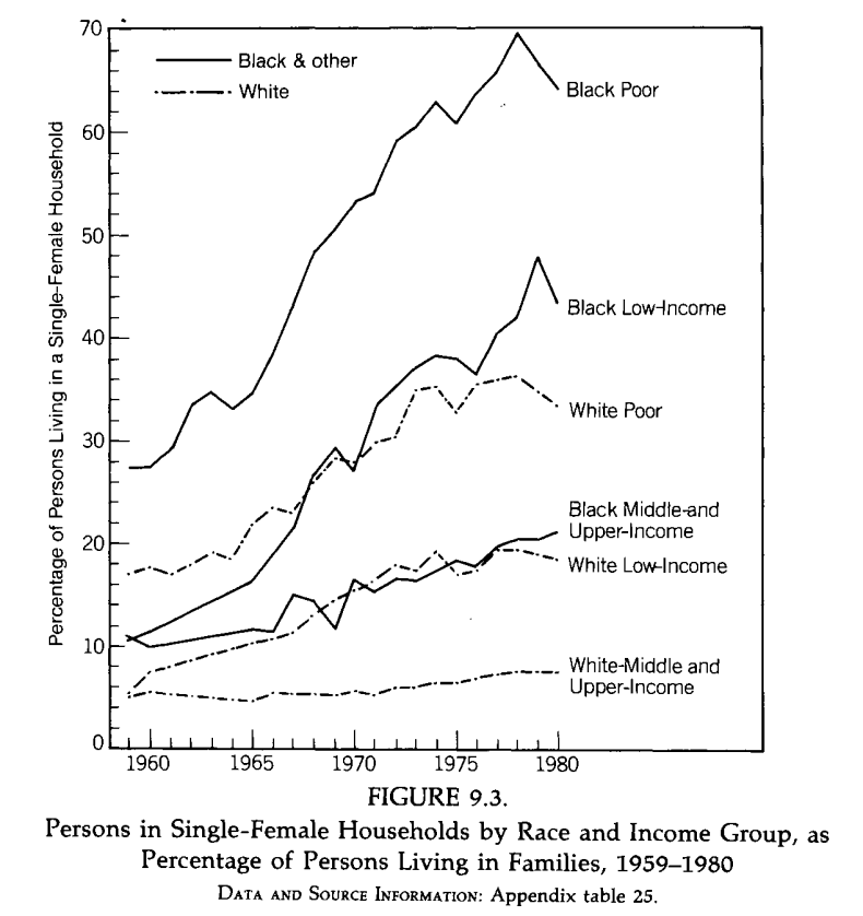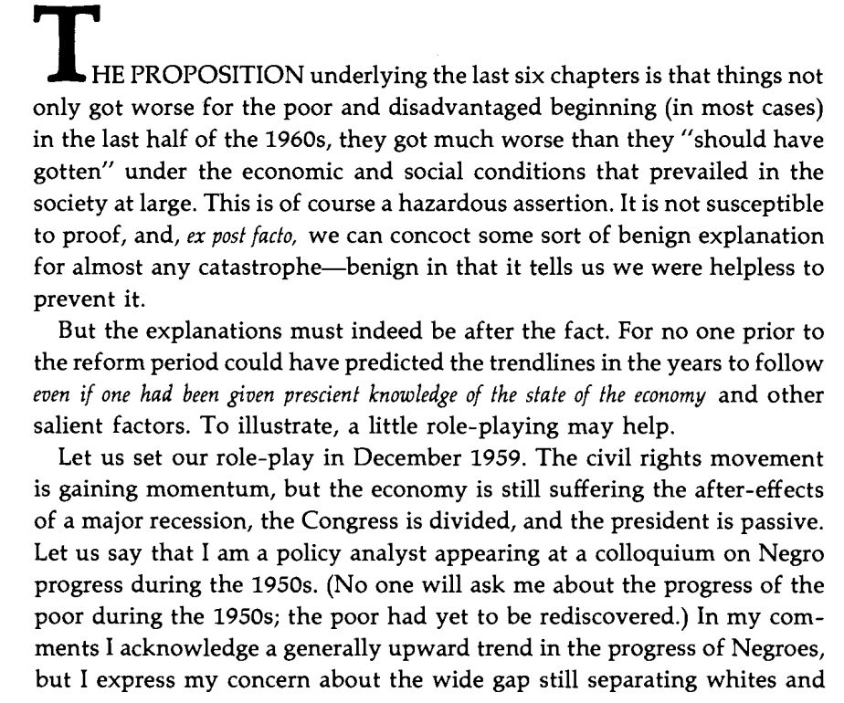 None of these strong negative trends for the poor and/or black were predicted ahead of time. If you told someone in 1959 about the CRA, jobs programs, education funding explosion, affirmative action of the next decade, they'd assume black problems would be quickly solved. Image