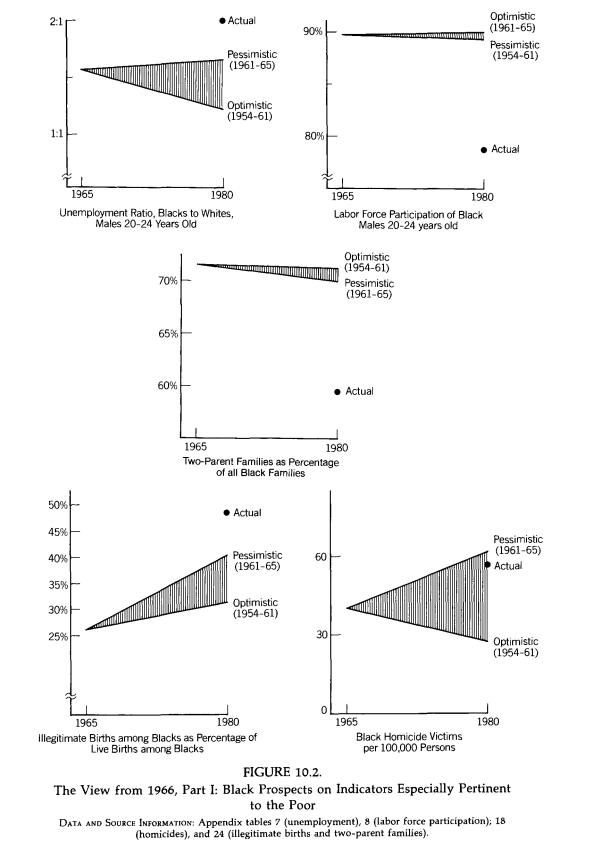 The actual state of poor black America in 1980 was much worse than an observer in 1965 would have predicted based on the 1954-61 or 1961-65 trends. Image