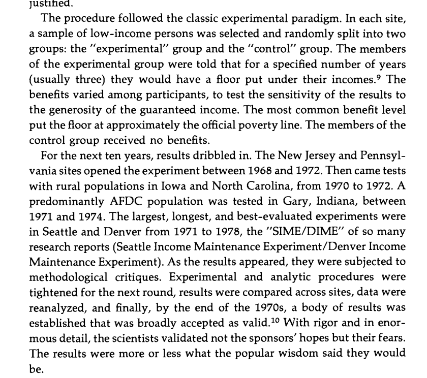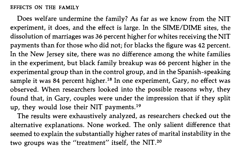 The Negative Income Tax experiment (NIT), an RCT of providing... a negative income tax to floor incomes at the poverty line. Results: less employment, especially among young single men, greatly increased divorce. Image