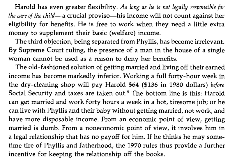 The change in incentives created by the expansion of welfare and Supreme Court rulings for a potential young couple - by 1970 not working or marrying and living off of welfare became a much better choice relative to marriage and a job compared to 10 years earlier. Image