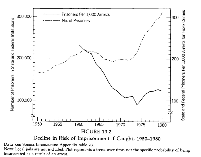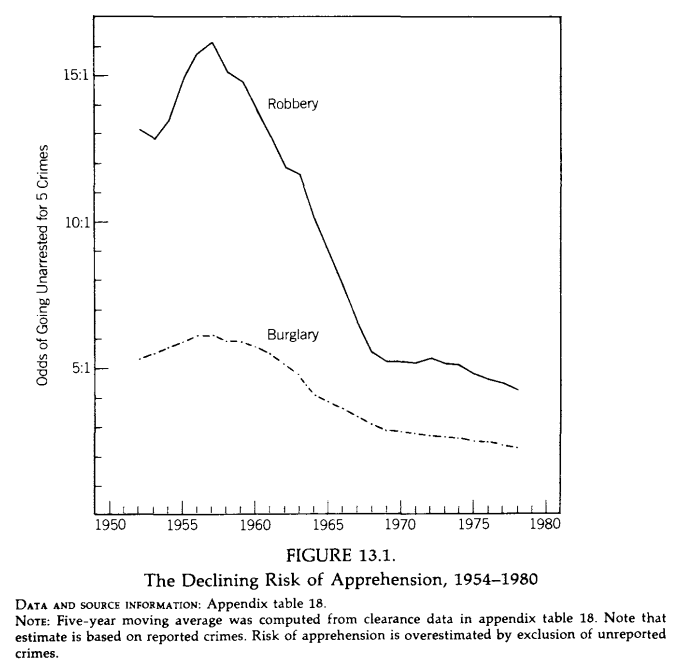 Like the collapse in marriage and working among poor young Americans post-Great Society, the spike in crime also has a rational, incentives-based explanation: odds of getting away with it got much better, and risk of imprisonment if caught fell. Image