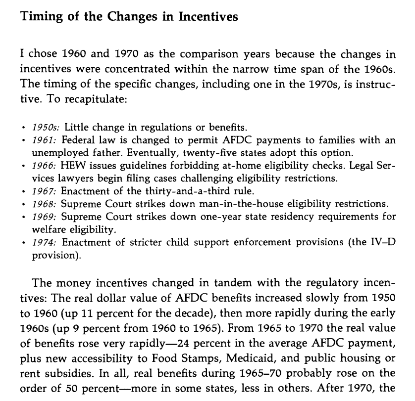The timeline of major changes. The 1968 strike down of the main-in-the-house eligibility restriction for AFDC was particularly important; it made working economically irrational for lower class men with baby mamas. Image