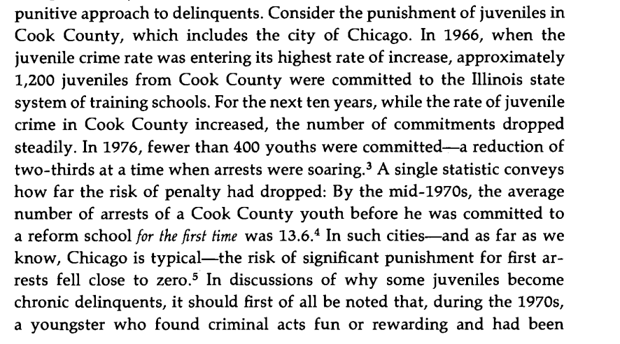 Juvenile delinquency can also be explained rationally - the number of delinquents sent to reform schools collapsed (average number of arrests before being sent in Cook County by the 70s: 13.6 (!)) and juvenile court records starting getting sealed or destroyed at 18. Image