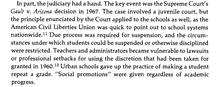 The Supreme Court's Gault v Arizona made traditional school discipline measures such as suspension or holding someone back a grade much more administratively/legally difficult. Image