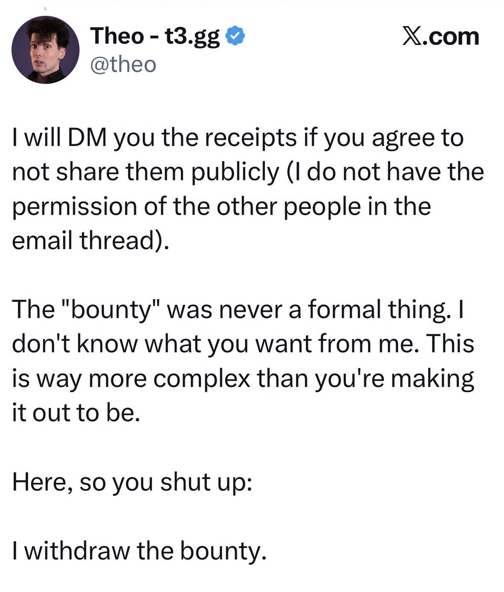@Theo says this has been “privately settled” and has deleted his X post offering the monetary bounty.