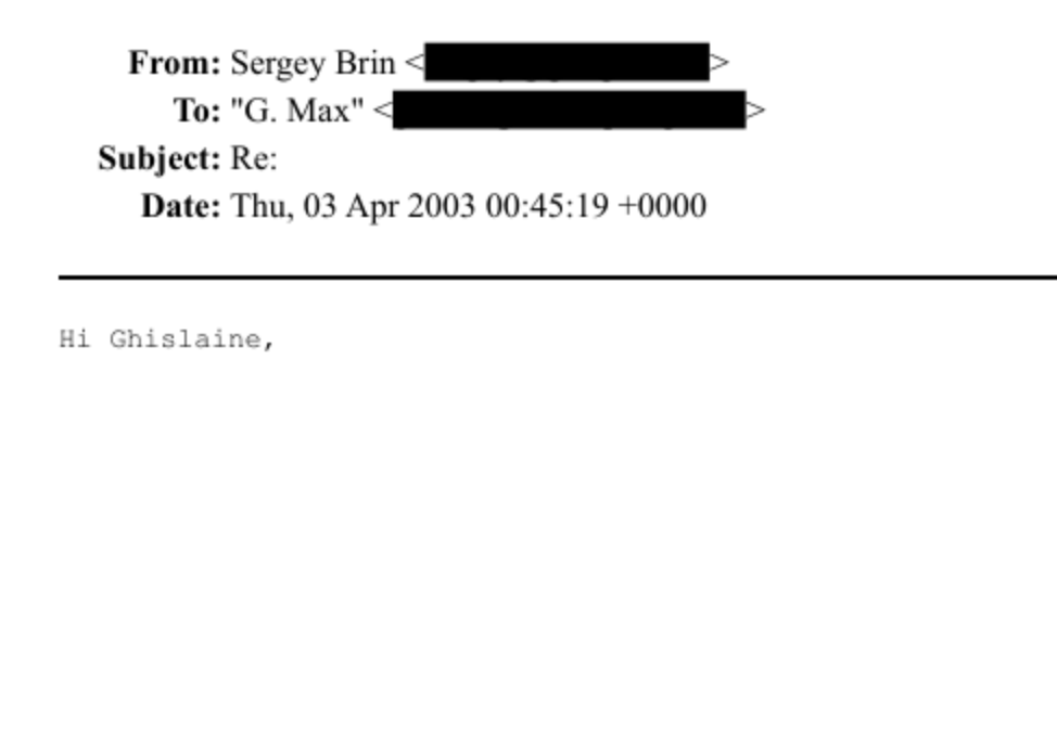Plus a whole lot of emails, from Sergey, which simply say "Hi Ghislaine,"... and appear to be blank after that (possibly whited out?).