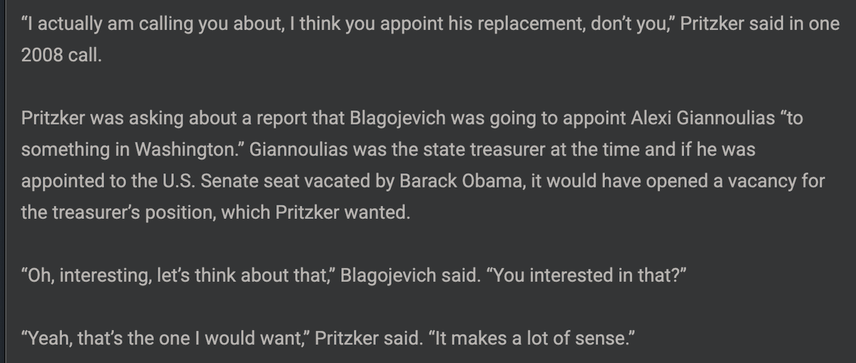 He wanted State Treasurer Alexi Giannoulias appointed to the Senate, which would have opened the Treasurer slot... for JB Pritzker.