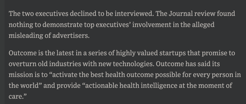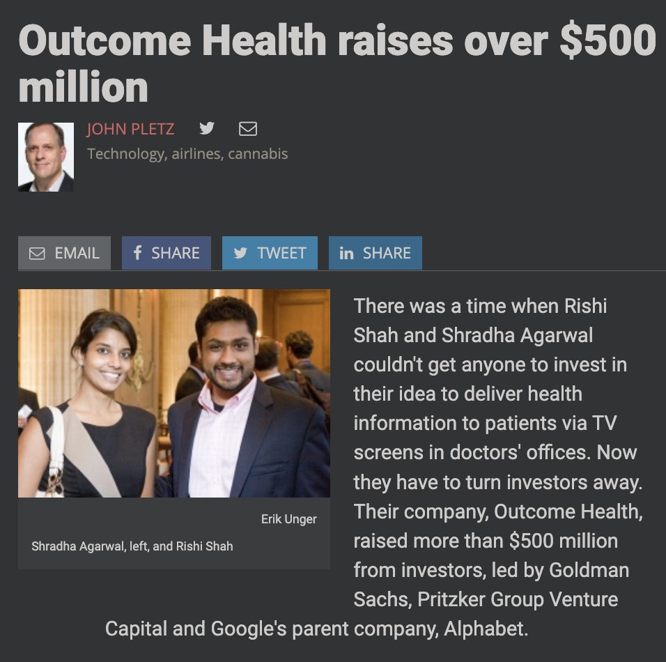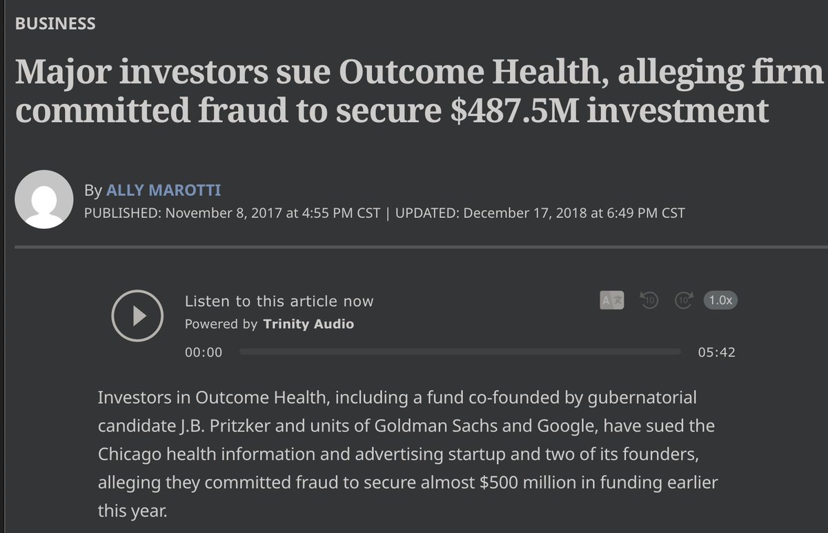 In 2017, Pritzker Group Venture Capital heavily invested in the Chicago health tech firm Outcome Health. Later that year, the Wall Street Journal reported that three employees at Outcome had misrepresented information to advertising clients, but said there was no evidence senior management knew of the misconduct.