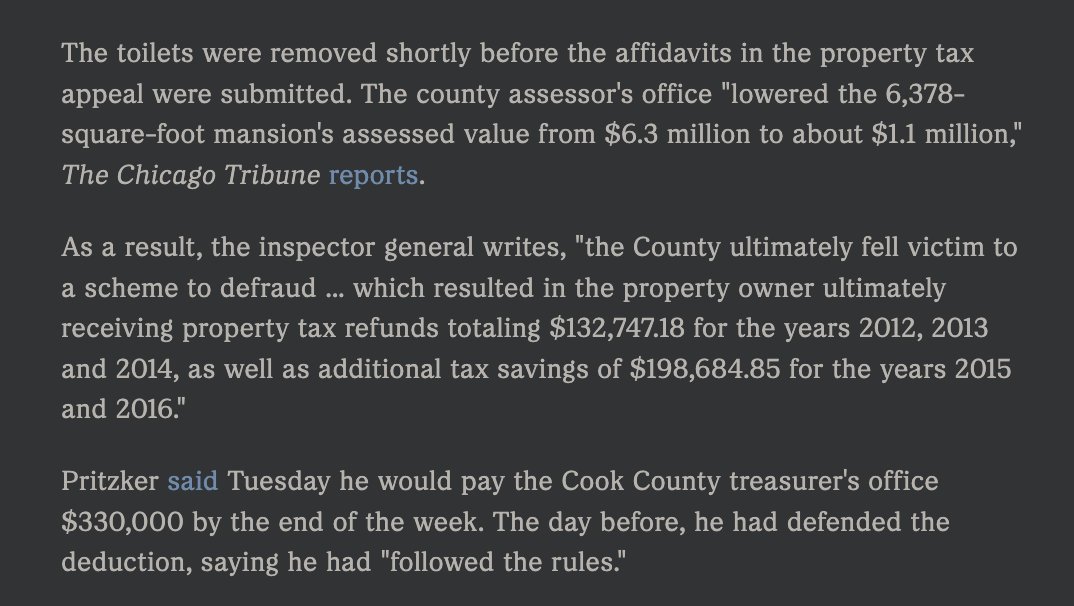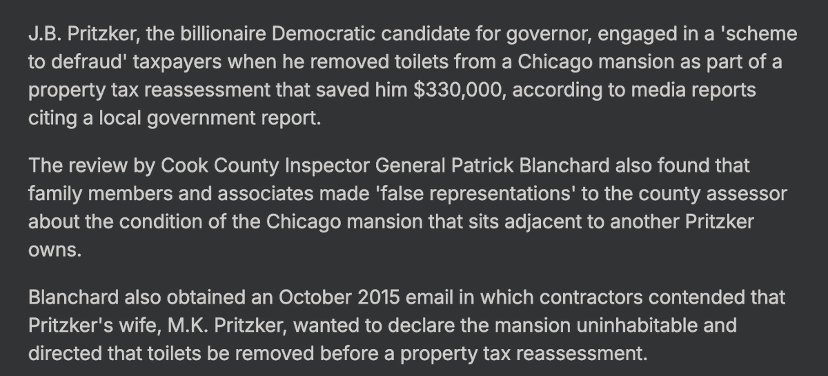 JB Pritzker (worth 3.6 billion) had the toilets removed from his Chicago mansion... to dodge a $331,000 property tax bill. You read that correctly.