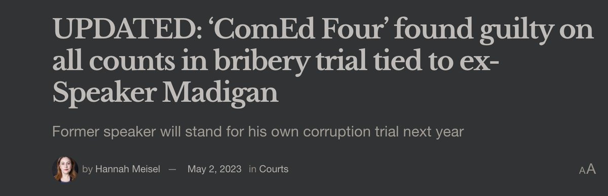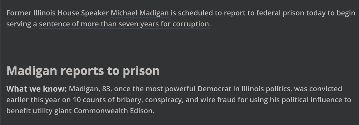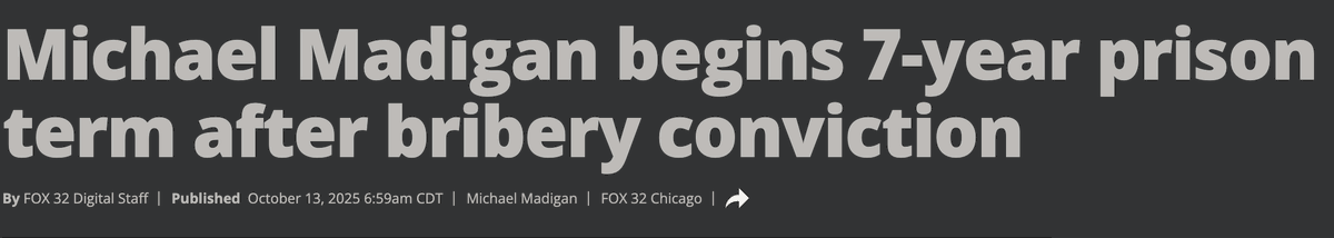 On July 2025, Madigan was found guilty on racketeering and bribery. October 2025, he reported to federal prison to serve 7+ years.