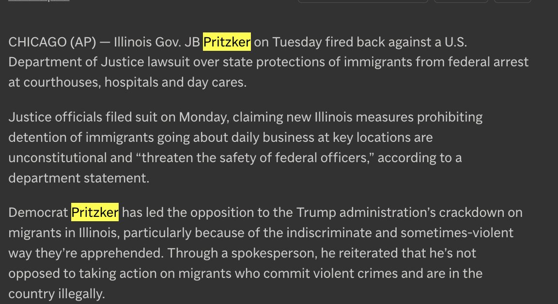 In Dec 2025, DoJ sued Illinois and named Pritzker personally as defendant over state laws shielding immigrants from ICE at courthouses, hospitals, and day cares.