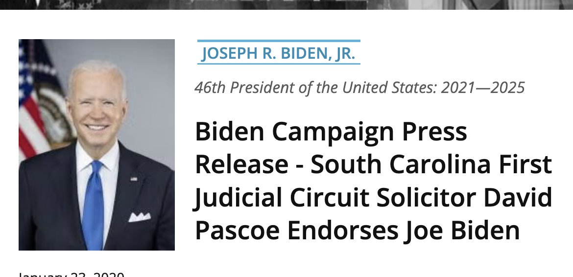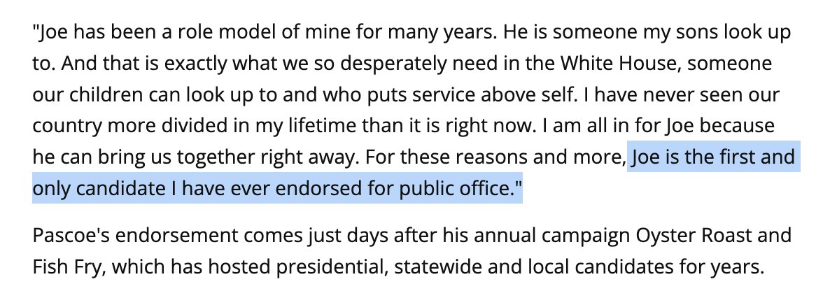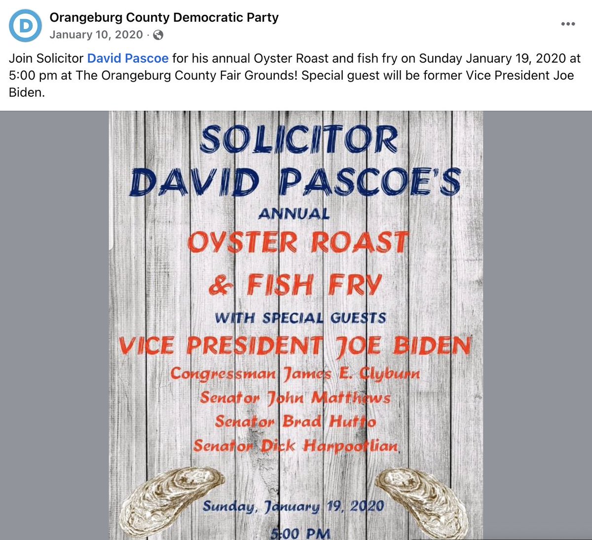 Before that endorsement, Biden came to Pascoe's turf. In Jan 2020, Biden attended Pascoe's annual Oyster Roast & Fish Fry at the Orangeburg County Fairgrounds... over 250 people. This was Pascoe's event, his crowd, his stage.