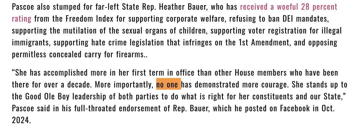 Bauer also: opposed the ban on DEI mandates, opposed permitless concealed carry, and supported voter registration provisions for illegal immigrants. This is who Pascoe said showed "more courage" than any other SC House member.
