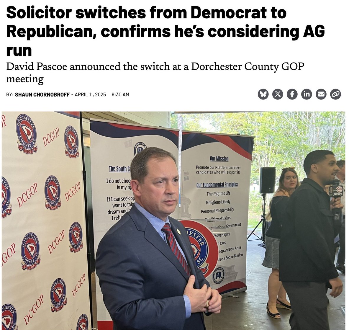 David Pascoe spent 20+ years as an elected Democrat, 6 consecutive terms as SC First Circuit Solicitor. On April 10, 2025, he switched to the GOP. SC Dem Chair Christale Spain says he "has been trying to find a lane to run for higher office."
