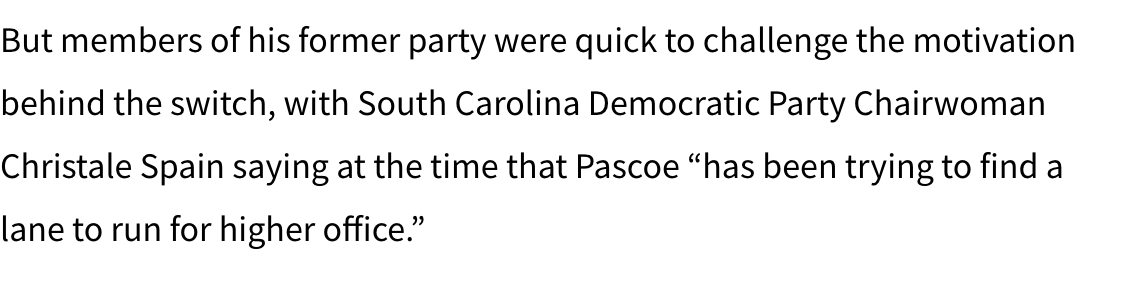 @davidpascoesc SC Democratic Party Chair Christale Spain had the most honest take on all of it: Pascoe "has been trying to find a lane to run for higher office." No Democrat wins statewide in SC. He needed a different lane.