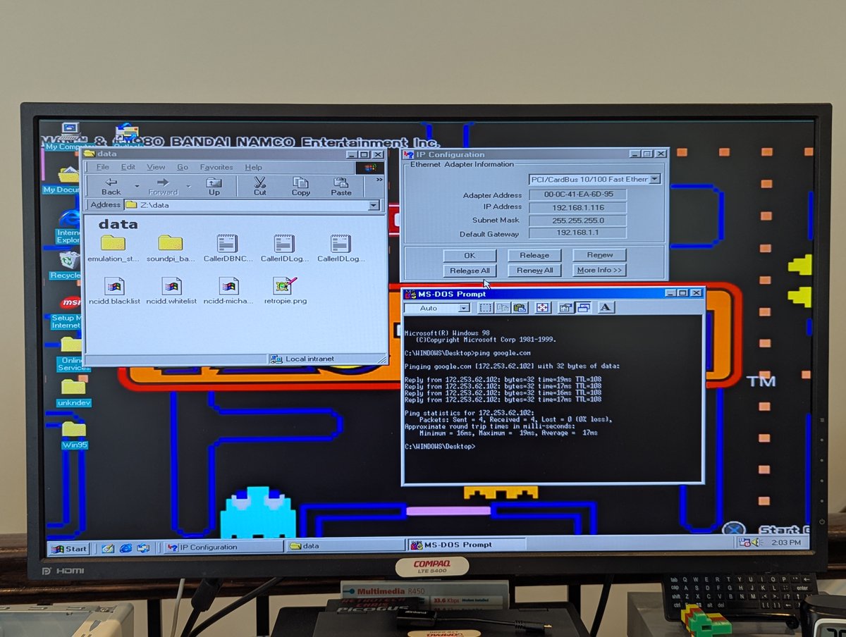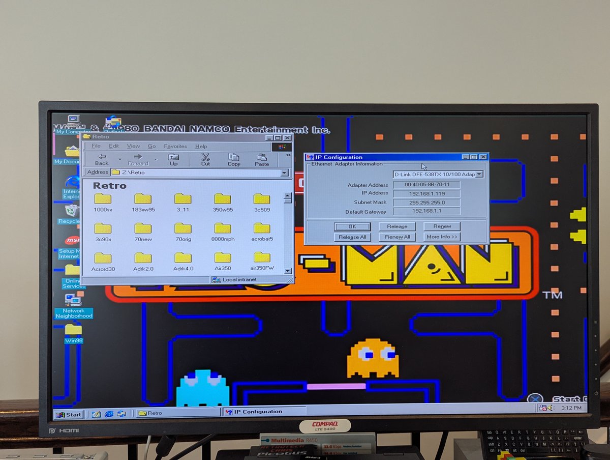 Next we have this Intel EtherExpress Pro 100. Windows 98 had the drivers available for it! It works great, despite me showing the wrong winipcfg in the last screenshot š. Success!