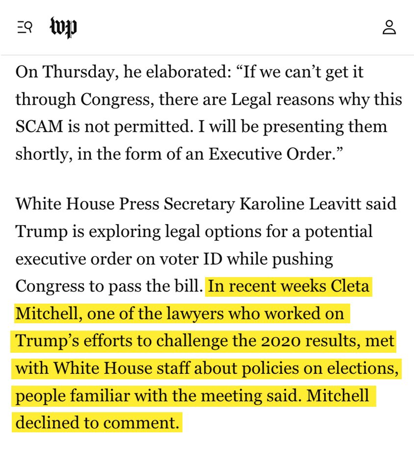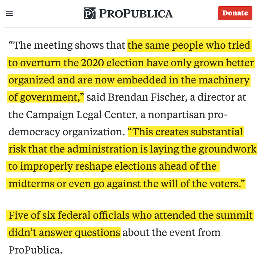 Today, ProPublica reports that Trump officials – including a White House lawyer and the U.S. Department of Homeland Security election integrity chief – met with election deniers pushing for a national emergency to take over the 2026 midterm election. propublica.org/article/electi…