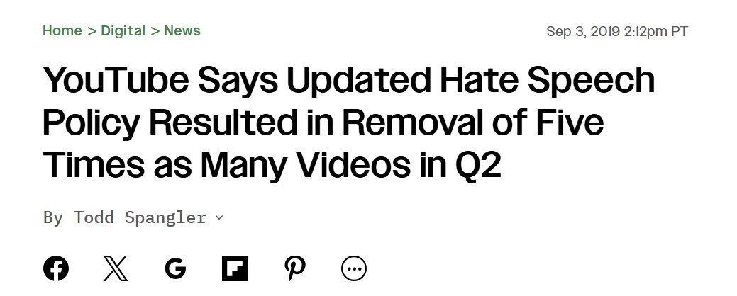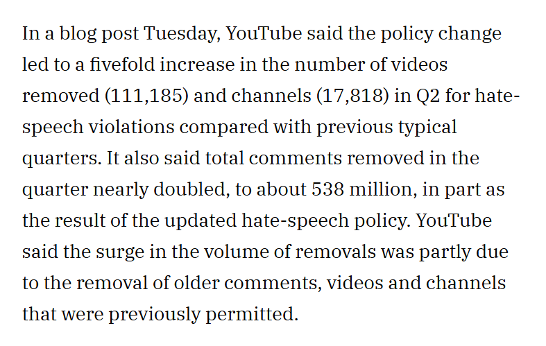 In Q2 2019, Google began "prohibiting videos alleging group superiority" [no prizes for guessing for which groups this was enforced] and as a consequence ramped up suspensions fivefold, banning more than 17,000 channels and deleting more than 100,00 videos and 500M comments.