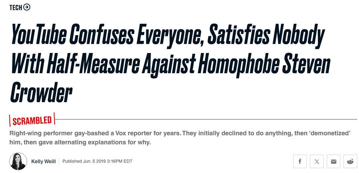 In June 2019, YouTube demonetized and then banned Steven Crowder for calling a Vox journalist an "anchor baby" and a "lisping queer", which they acknowledged did not violate their policies [also note the Daily Beast calling insults "gay bashing," which they are not].