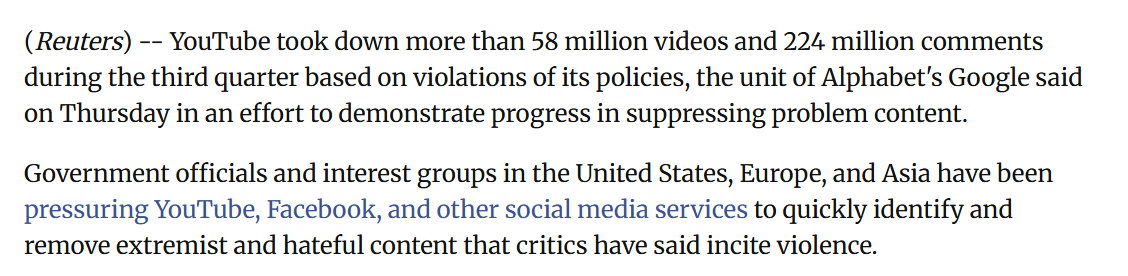 Some of this zeal (more than 58M videos removed in Q3 2018) was to "demonstrate progress in suppressing problem content" to "government officials and interest groups [read: astroturfed NGOs]" who were (and are - see the UK's OSA) keen to control what is on YouTube.