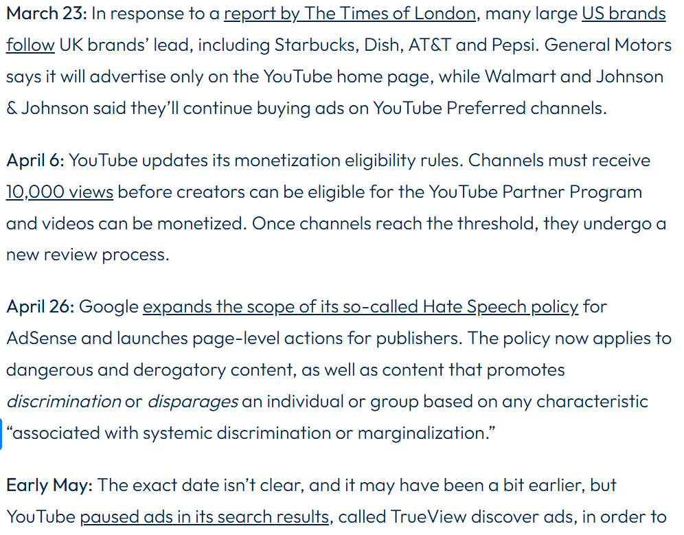 Google then began restricting ads/monetization to large accounts that had been manually reviewed, and greatly expanded the scope of its hate speech policy (for instance, banning insults "associated with marginalization" - no points for guessing who defines that).