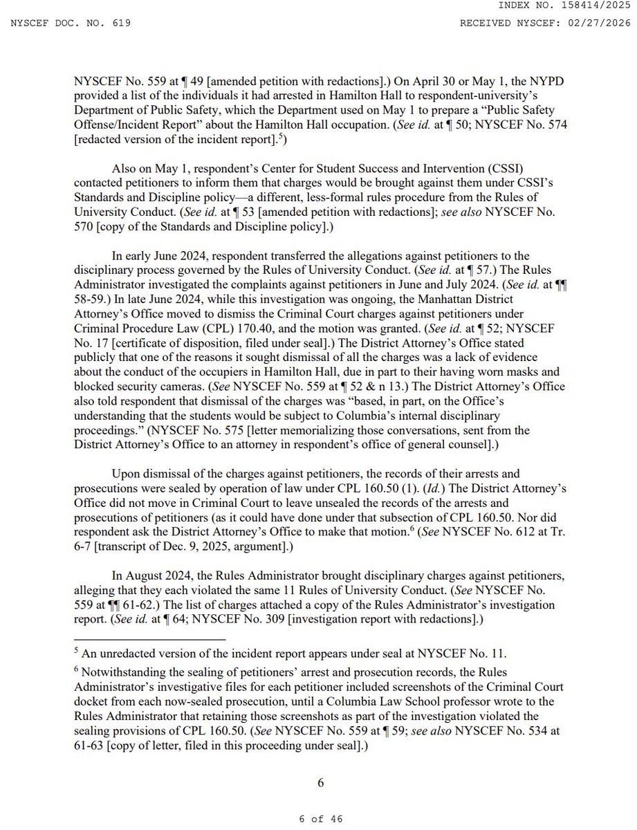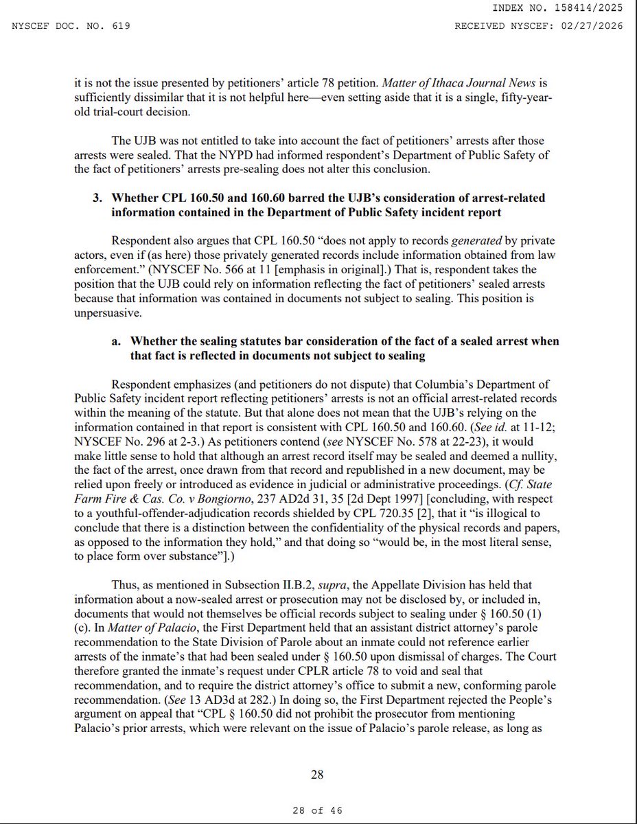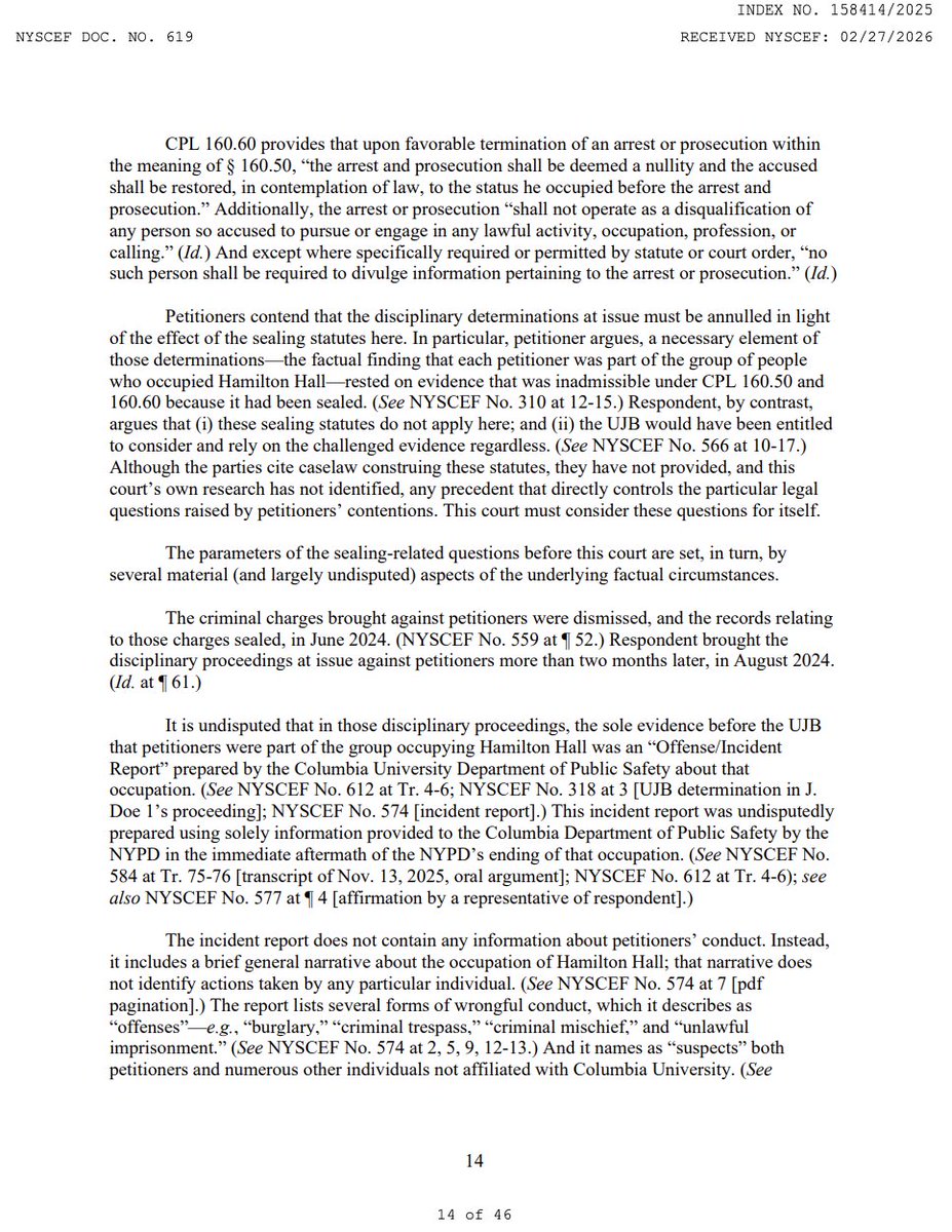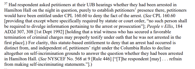 And this is where it becomes truly absurd. The court notes that had @Columbia asked petitioners at their UJB hearings whether they had been arrested in Hamilton Hall, the students would have been legally entitled under CPL 160.60 to deny it. The First Department has held "that a trial witness who has secured a favorable termination of criminal charges may properly testify under oath that he was not arrested in the first place." (10/19)Image