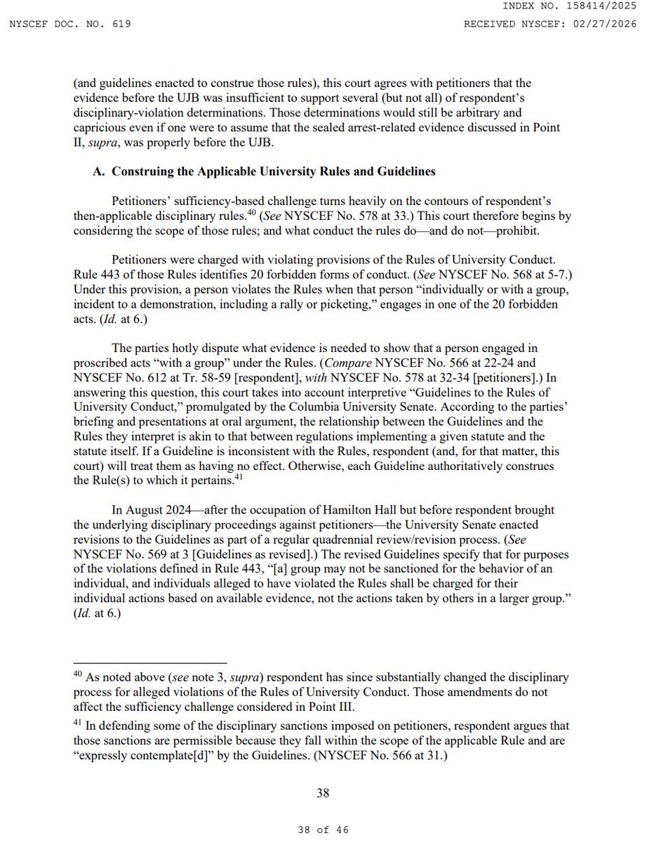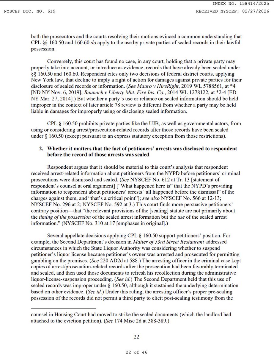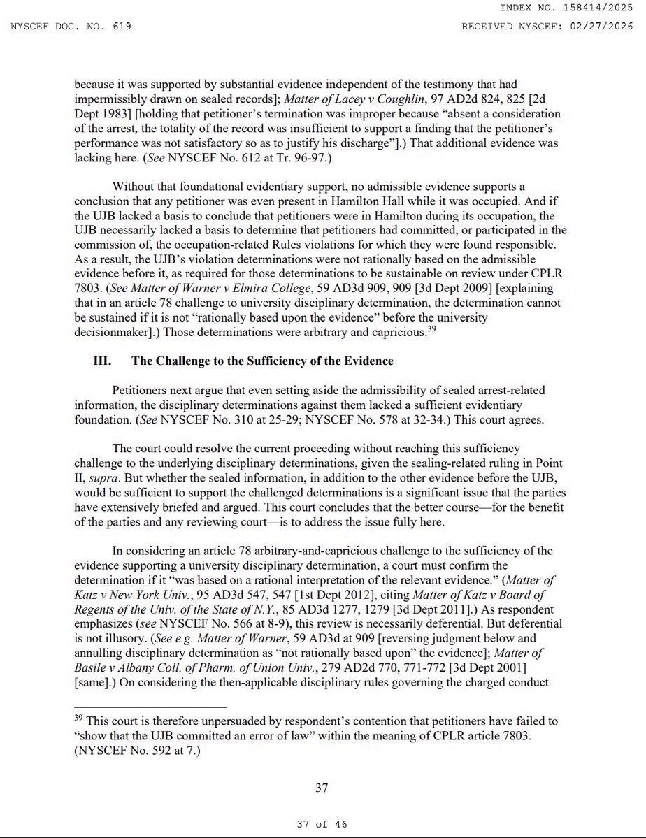 And this is where it becomes truly absurd. The court notes that had @Columbia asked petitioners at their UJB hearings whether they had been arrested in Hamilton Hall, the students would have been legally entitled under CPL 160.60 to deny it. The First Department has held "that a trial witness who has secured a favorable termination of criminal charges may properly testify under oath that he was not arrested in the first place." (10/19)Image