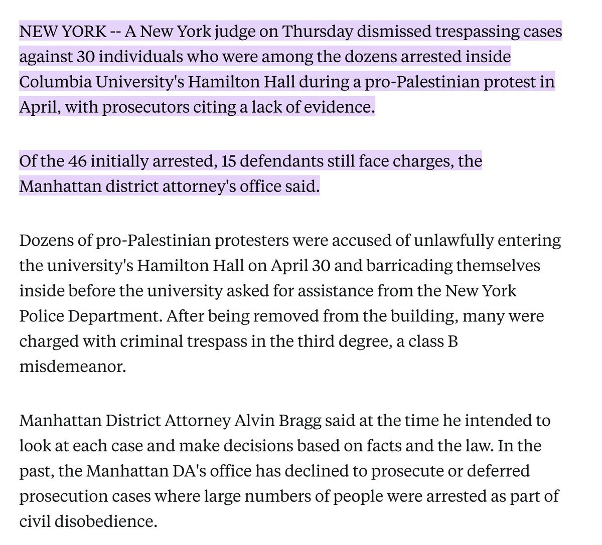 Bragg dropped all criminal charges in June 2024 under CPL 170.40, publicly citing a lack of evidence about individual conduct inside Hamilton, "due in part to their having worn masks and blocked security cameras." His office also told @Columbia that dismissal was "based, in part, on the Office's understanding that the students would be subject to Columbia's internal disciplinary proceedings."