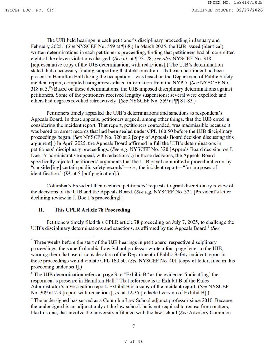 That same professor wrote a four-page letter to the UJB three weeks before hearings began, warning that use of the incident report would violate CPL 160.50. The UJB used it anyway. The Appeals Board affirmed, specifically rejecting the argument that considering "certain public safety records" for "purposes of identification" was procedural error. The university president then denied discretionary review. Every level of @Columbia's internal process failed. (17/19)Image