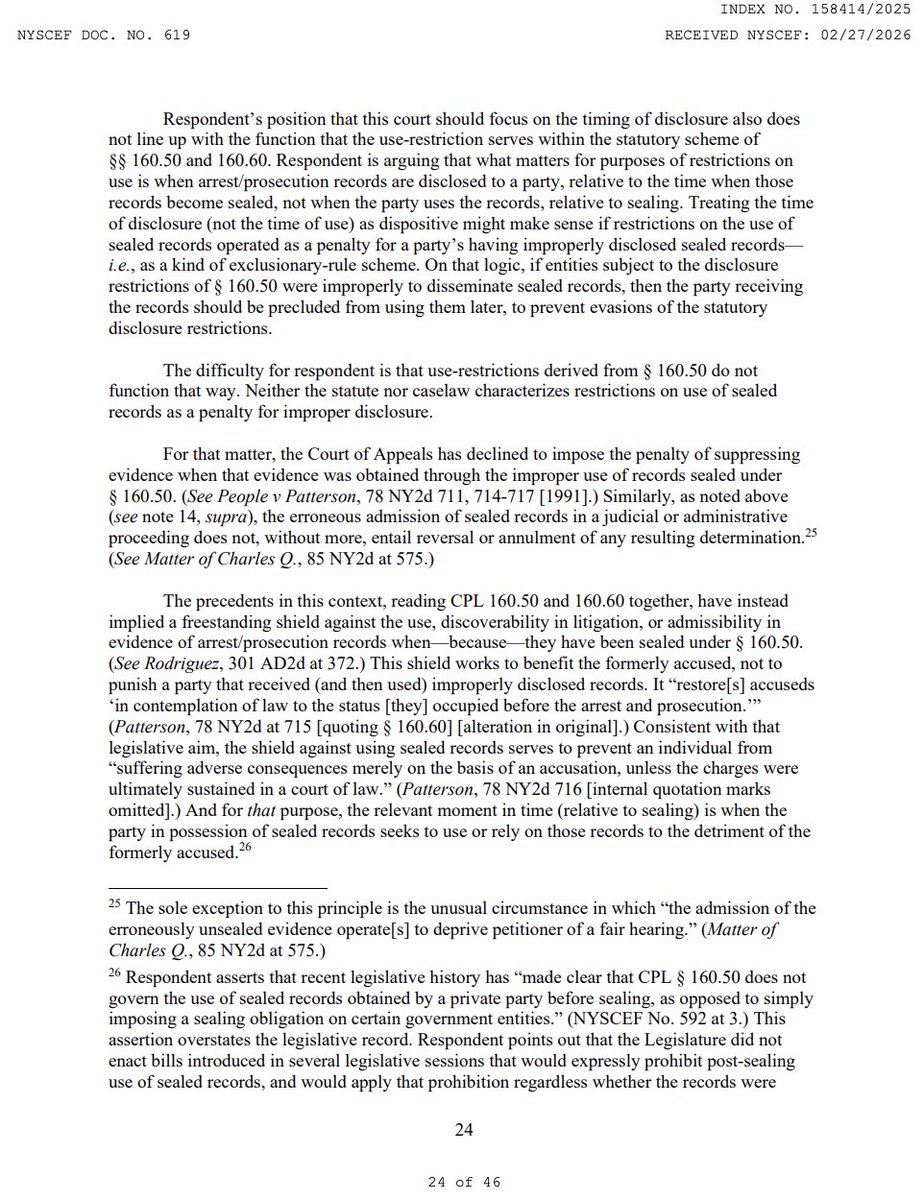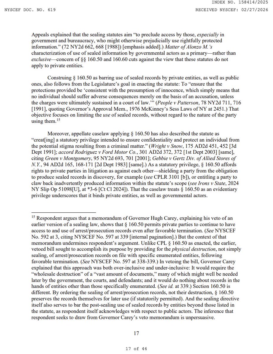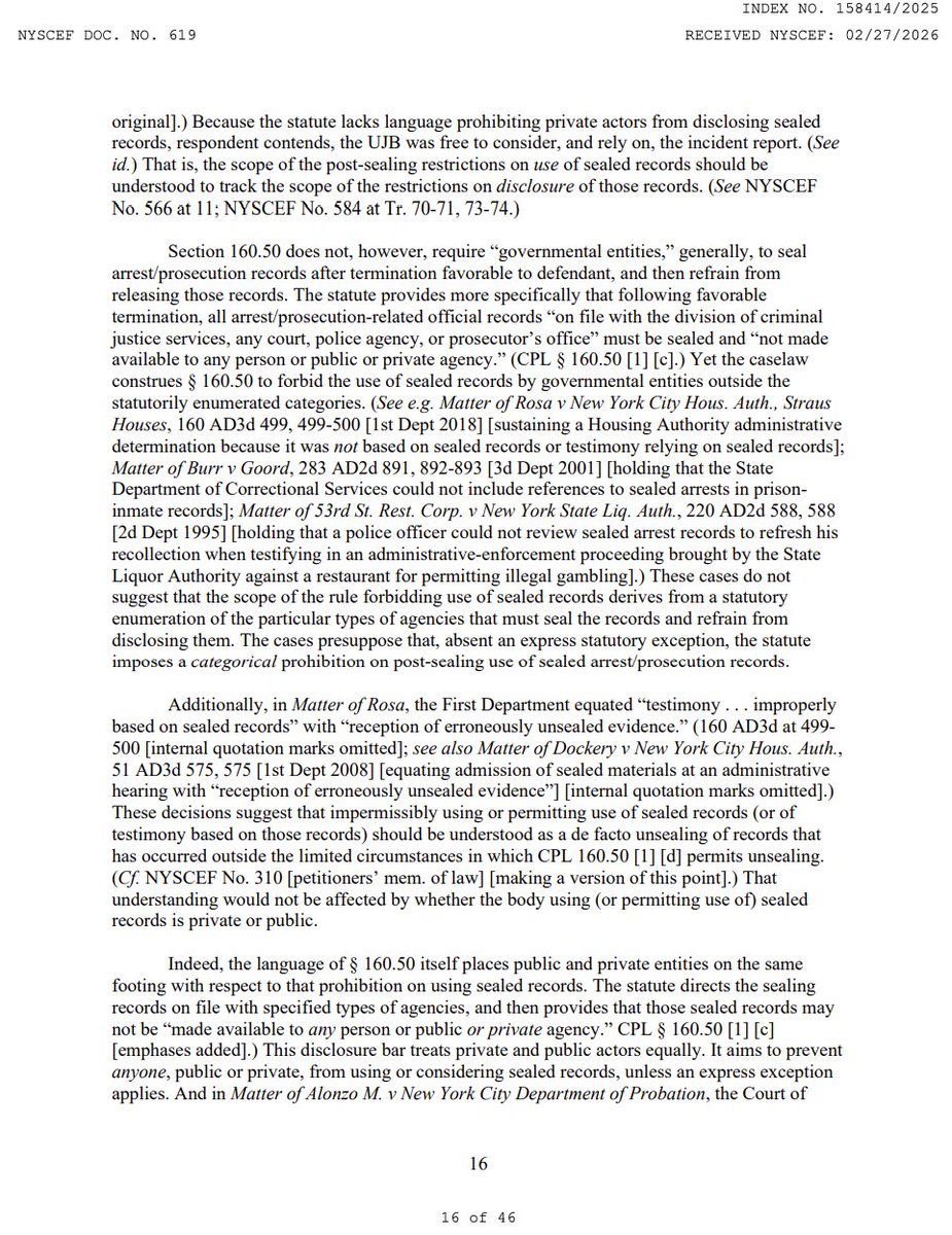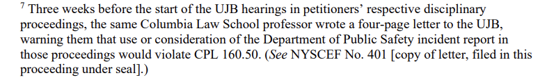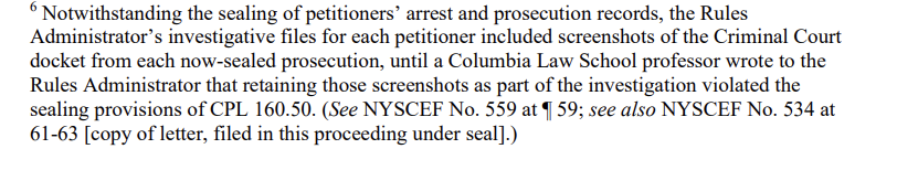 You can't make this up: @Columbia's Rules Administrator initially included screenshots of petitioners' Criminal Court dockets in their investigative files, until a Columbia Law School professor wrote to warn that retaining those screenshots violated CPL 160.50. A professor had to tell the university's own disciplinary apparatus that it was breaking the law. (16/19)Image
