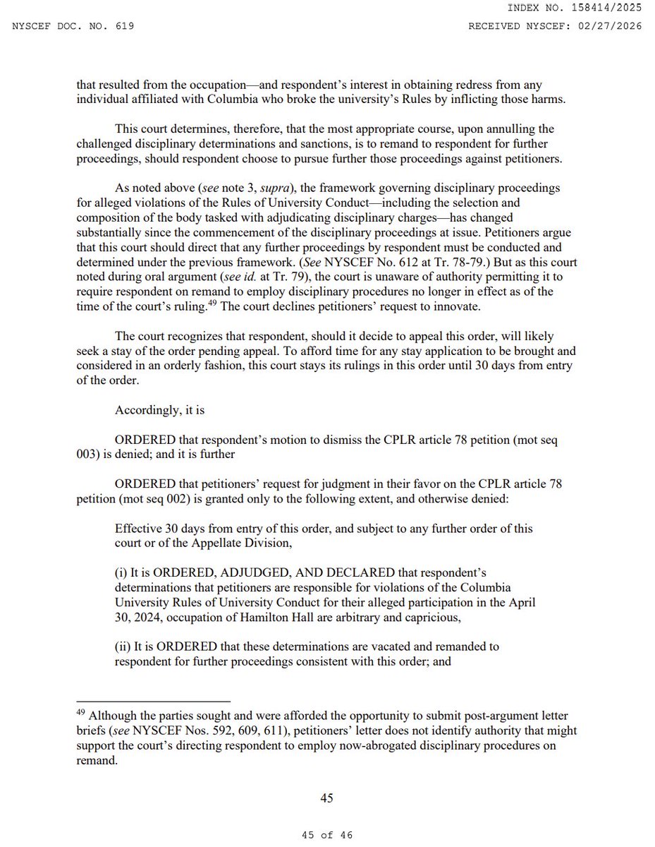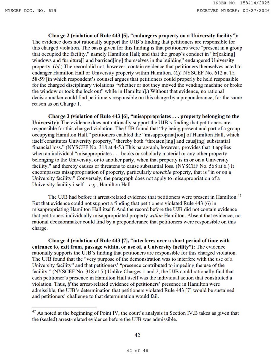 The court vacates every sanction, every expulsion, every degree revocation, and remands for "further proceedings." Consider what that means practically: @Columbia now has to independently prove who was inside Hamilton Hall and what each individual did, nearly two years after the occupation, knowing the occupiers obscured their identities and destroyed security footage. Good luck. (18/19)Image
