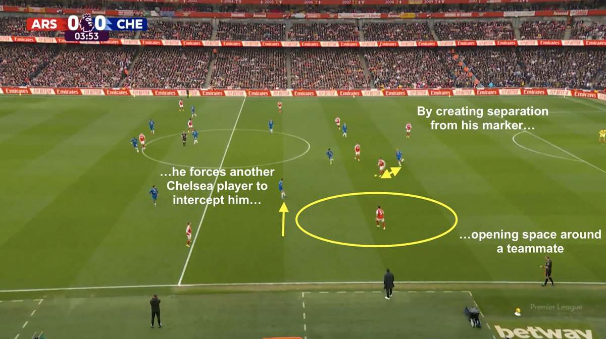 Another way of generating this separation is through players rotating positions; literally shifting around in a bid to gain a yard of space on their marker or maybe to create confusion in their opponent’s defensive structure. Here’s an example sequence from the Chelsea game: