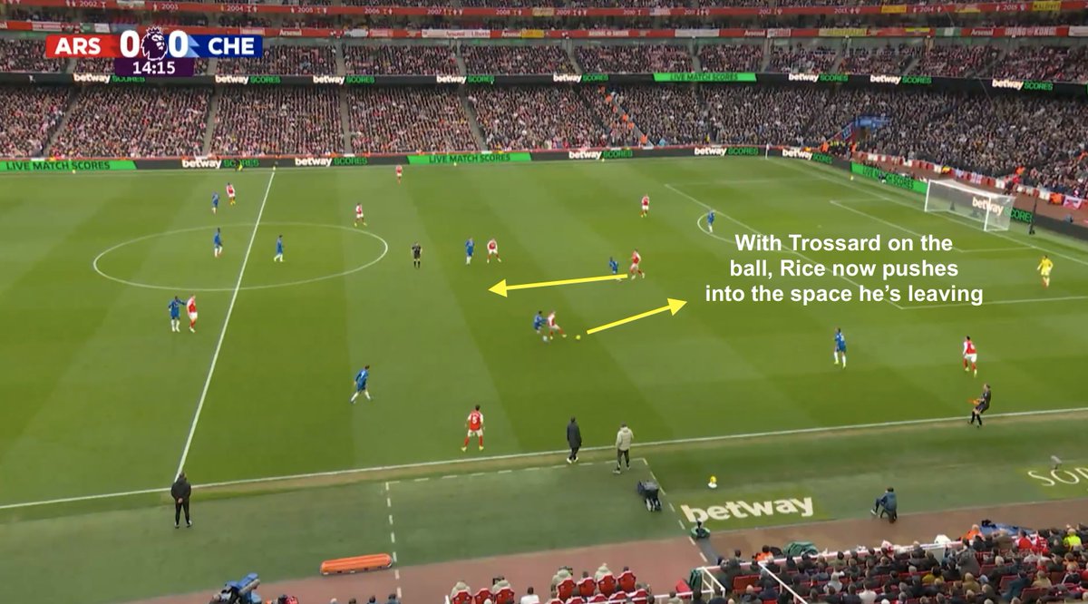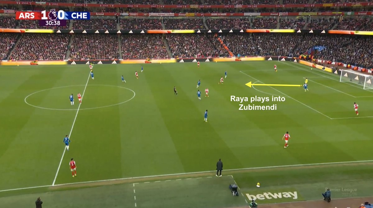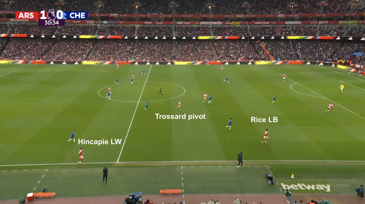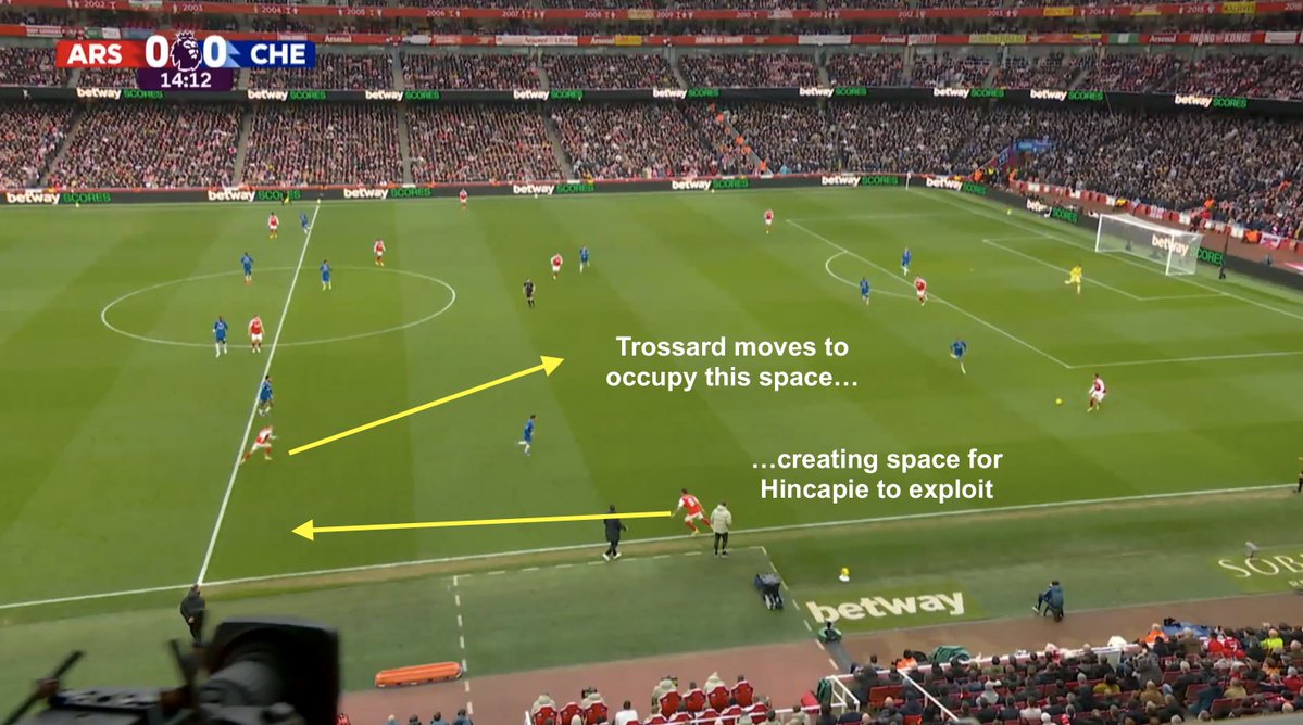 In this example, William Saliba carries the ball into space to create tensions in the Chelsea man-to-man structure: