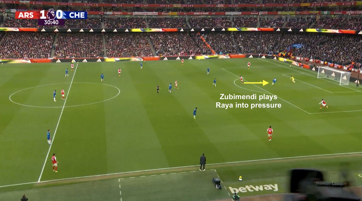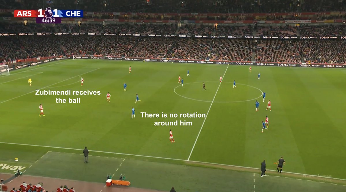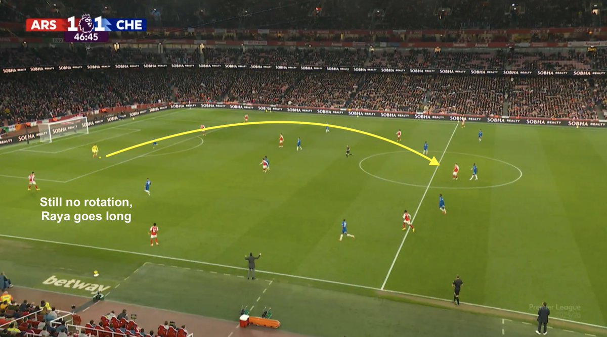 Of course, in this instance, the risk comes from attempting to build up vs a man-to-man opponent rather than from the fall out of being more fluid. But this clearly spooked Arsenal who quickly shifted the way they played.