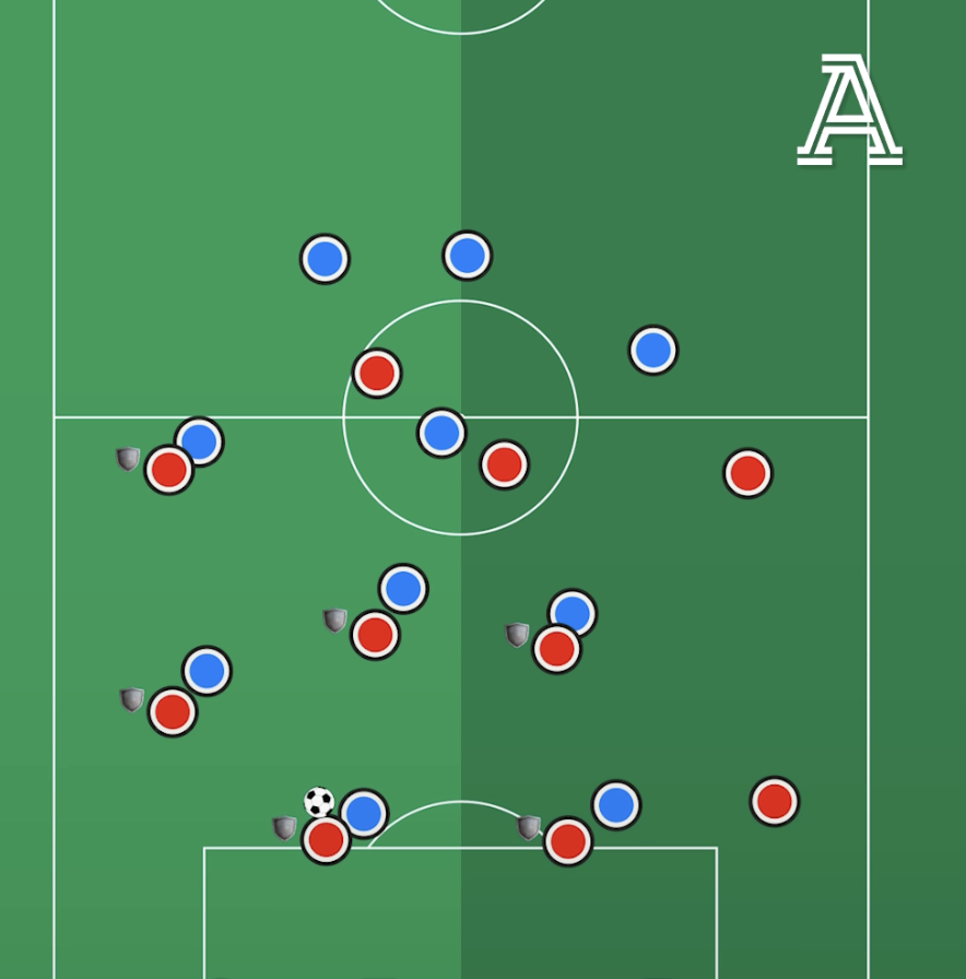 This makes sense if you consider that the solution to ball progression in this instance is to go long. And if you go long, you want to make sure your team are well set-up to counterpress.