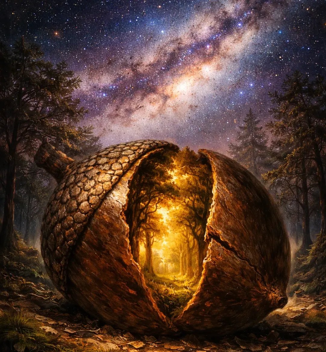 The seed doesn't contain the forest. It contains the information that tells the world how to become one.