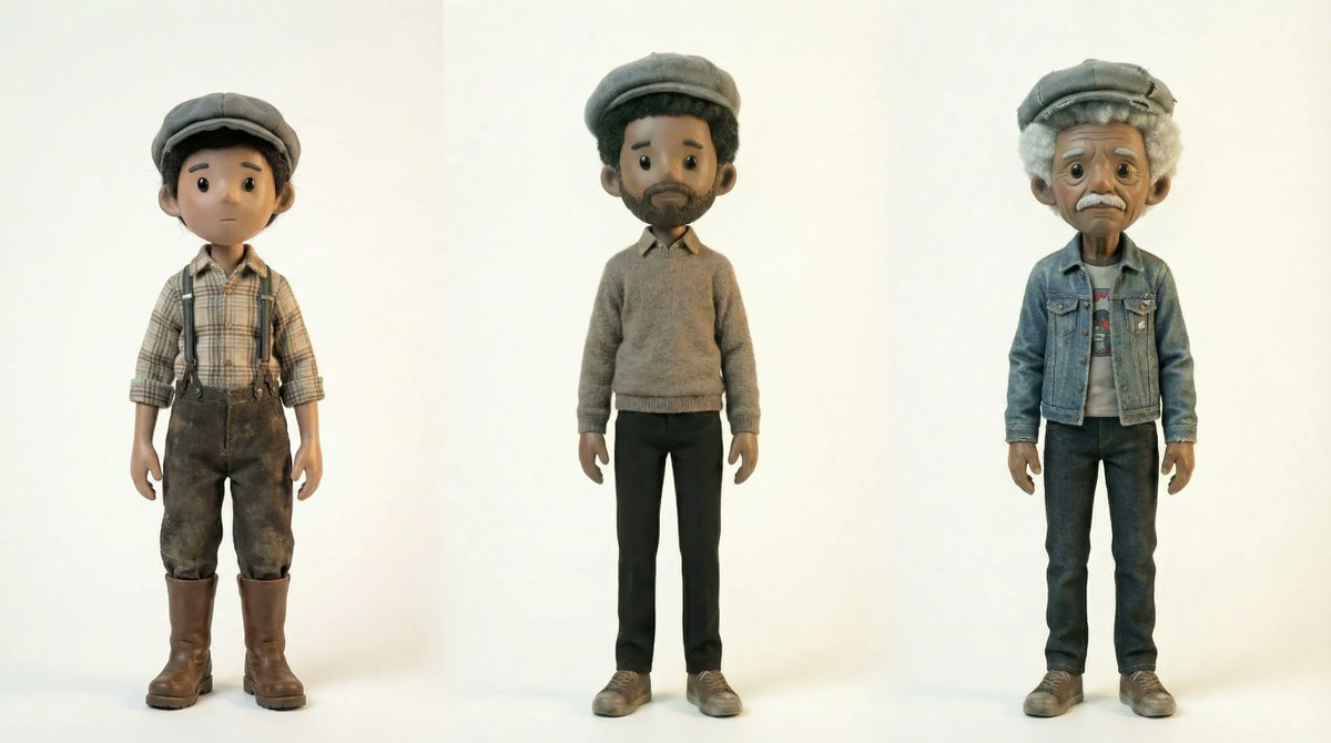 "Three character-study versions of the same child at different ages: a slightly more slender adult and a rounder senior with a softer overweight belly and noticeably thinner legs, each with perfectly round black button-like eyes, posed against a seamless pure white studio background that removes all distractions and focuses entirely on the three characters, illuminated for all three with the same soft warm even studio lighting that creates delicate shadows.