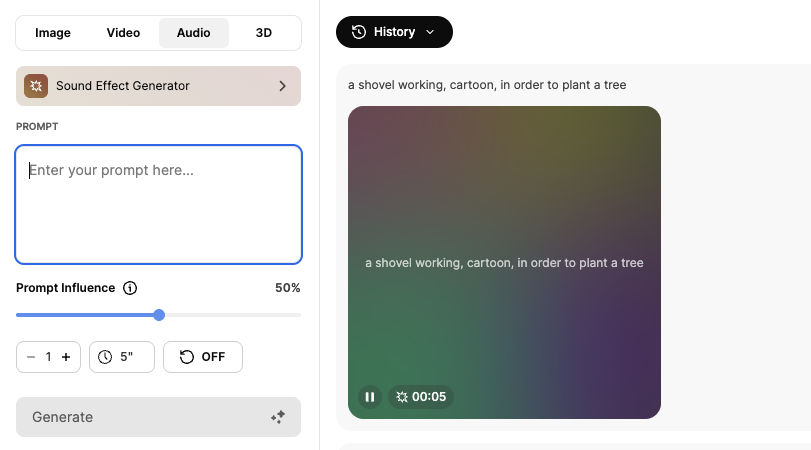 Every sound effect listed from the technical script was generated with the Sound Effect Generator before a single image or video was prompted