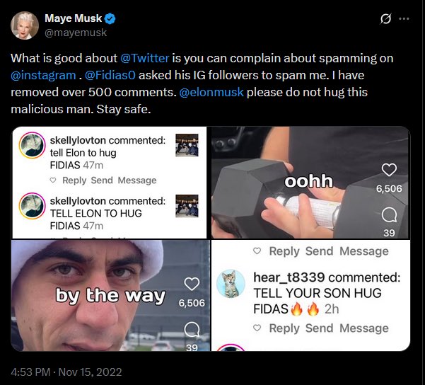 Sein beliebtestes Video mit 15 Mio Aufrufen ist über die „100 berühmtesten Persönlichkeiten der Welt“ zu umarmt. Die letzte Aufgabe war Elon Musk zu umarmen. Er rief seine Fans auf, Elons Mutter Maye mit Umarmungsanfragen zuzuspammen. Sie bezeichnete das als „bösartig“.